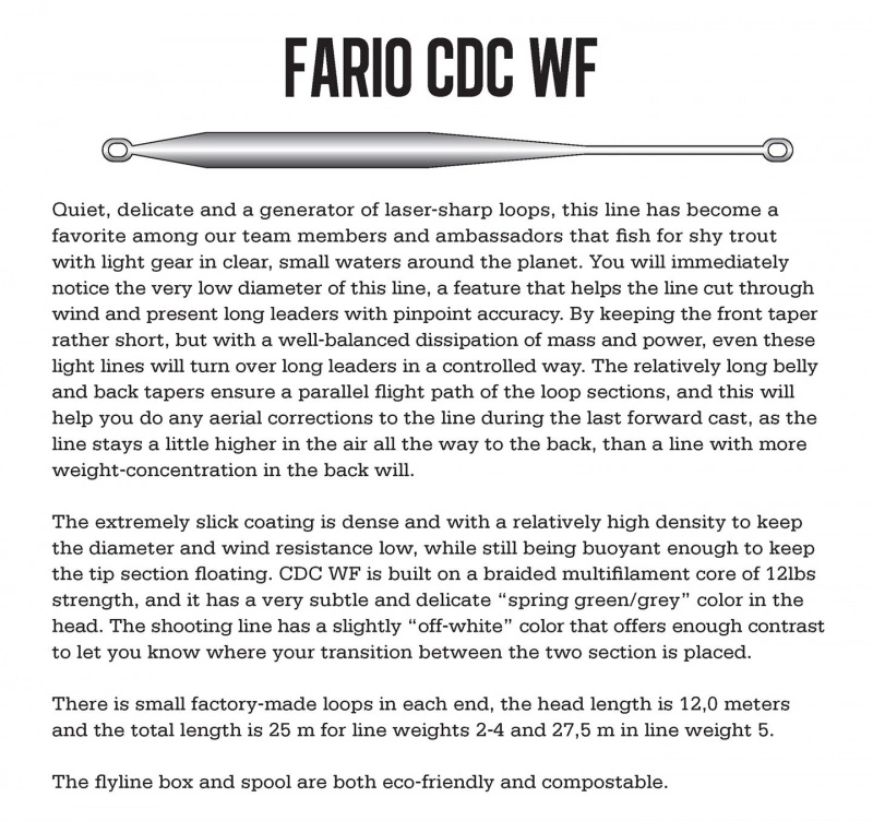 Quiet, delicate and a generator of laser-sharp loops, this line has become a favorite among our team members and ambassadors that fish for shy trout with light gear in clear, small waters around the planet. You will immediately notice the very low diameter of this line, a feature that helps the line cut through wind and present long leaders with pinpoint accuracy. By keeping the front taper rather short, but with a well-balanced dissipation of mass and power, even these light lines will turn over long leaders in a controlled way. The relatively long belly and back tapers ensure a parallel flight path of the loop sections, and this will help you do any aerial corrections to the line during the last forward cast, as the line stays a little higher in the air all the way to the back, than a line with more weight-concentration in the back will.Keeping the height as the line rolls out is also a great feature when you are setting the back cast high over obstacles behind and a great property when casting from lower positions from a boat or float tube. The extremely slick coating is dense and with a relatively high density to keep the diameter and wind resistance low, while still being buoyant enough to keep the tip section floating. Guideline CDC WF is built on a braided multifilament core of 12 lbs strength, and it has a very subtle and delicate “spring green/grey” color in the head. The shooting line has a slightly “off-white” color that offers enough contrast to let you know where your transition between the two section is placed. There is small factory-made loops in each end, the head length is 11,0-12,5 meters and the total length is 25 m for line weights 2-4 and 27,5 m in line weight 5. The fly line box and spool are both eco-friendly and compostable.Type of fishing: Trout – Dry fly & NymphFishing spot: Lakes, Rivers