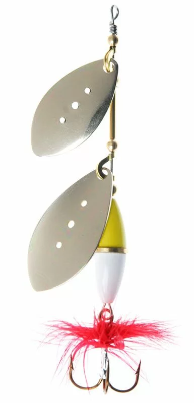 Wipp is a spinner out of the ordinary with enormous catching properties. The spoon has a design that perfectly supports the body. The body is two-colored and because the round pulley is slightly larger than the body, the spoon rests on the pulley in neutral position.Thus, the adhesion of the water does not affect, but the spoon starts immediately. Wipp is fitted with an ultra sharp hook and has Myran’s own attractive sound construction. Wipp Double is a surface spinner. Available in: 9 and 12 grams. Spoon colors: Silver-Gold-Cups -Black.