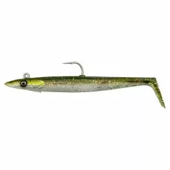 With a lively kicking action on both the drop and the retrieve, this super realistic sandeel imitation will fool even the wariest of predator fish. The unique jig head helps to ensure the lure moves with a perfect rolling and darting action. The Pro Peg body holder makes it possible to peg the body to the head with a toothpick, creating a very simple and secure hold. The soft PVC body comes pre-rigged with an internal glass rattle that gives off a provoking sound to any nearby hunting fish.Super realistic detailsLively kicking action on both retrieve and dropDarting jig head designForged carbon steel hook in tin finish in #3/0Removeable glass rattle in bodyPro Peg holder for effective holdSpare tail includedToothpicks supplied for Pro Peg mount