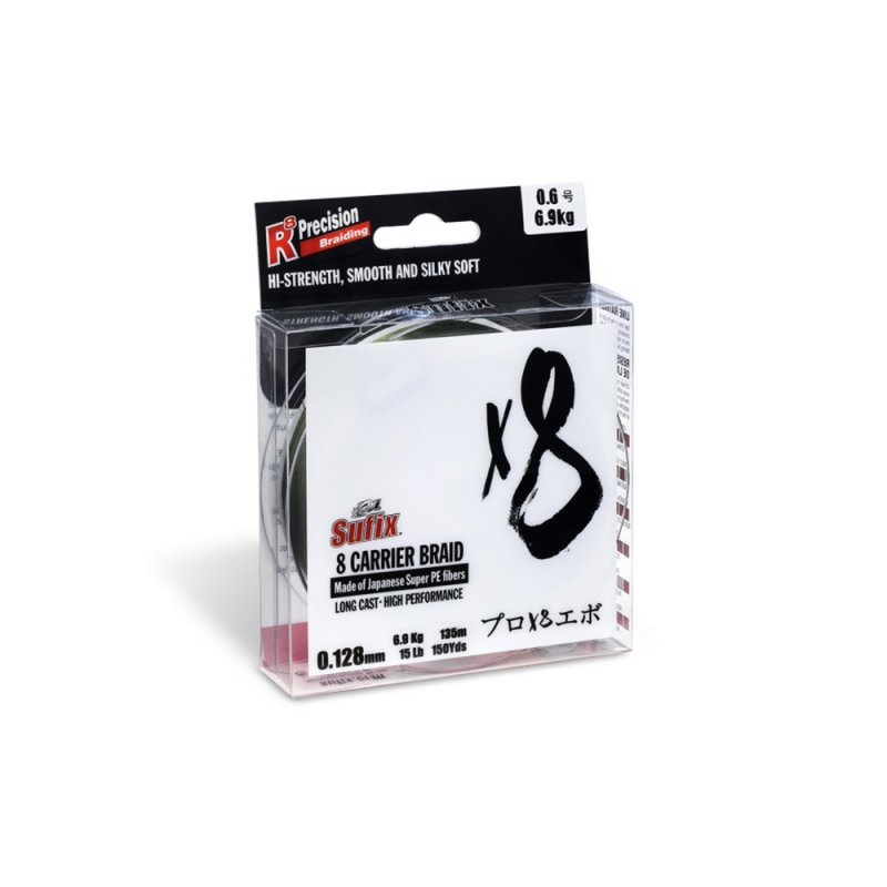 Sufix x8 is a round, easy to handle and silky-smooth Japanese-style braided line. It has an 8-carrier construction of thin HMPE fibers making it a super strong, thin line with high abrasion-resistance and superb knot and shock strength.The R8 Precision Braiding technology with a high-tension weaving process gives this line its distinct supple and smooth qualities that have consistent diameter and quality plus an excellent strength to diameter ratio.The materials and construction mean that the line has low friction when passing through the rod guides. This results in silent performance and long, accurate casts.Sufix x8 is designed for both casting and spinning reels. It is a great option for smaller lures, light soft plastics (jigging), perch, trout, rainbow trout and finesse fishing.• 8-carrier construction (thin HMPE fibers)• R8 Precision Braiding technology• Round and smooth braided line• Excellent strength to diameter ratioStrength:0.104mm 5.0kg0.128mm 6.9kg0.148mm 7.5kg0.165mm 10.5kg0.185mm 15.5kg0.205mm 17.5kg0.235mm 20kg0.285mm 22.5kg0.330mm 26.5kg